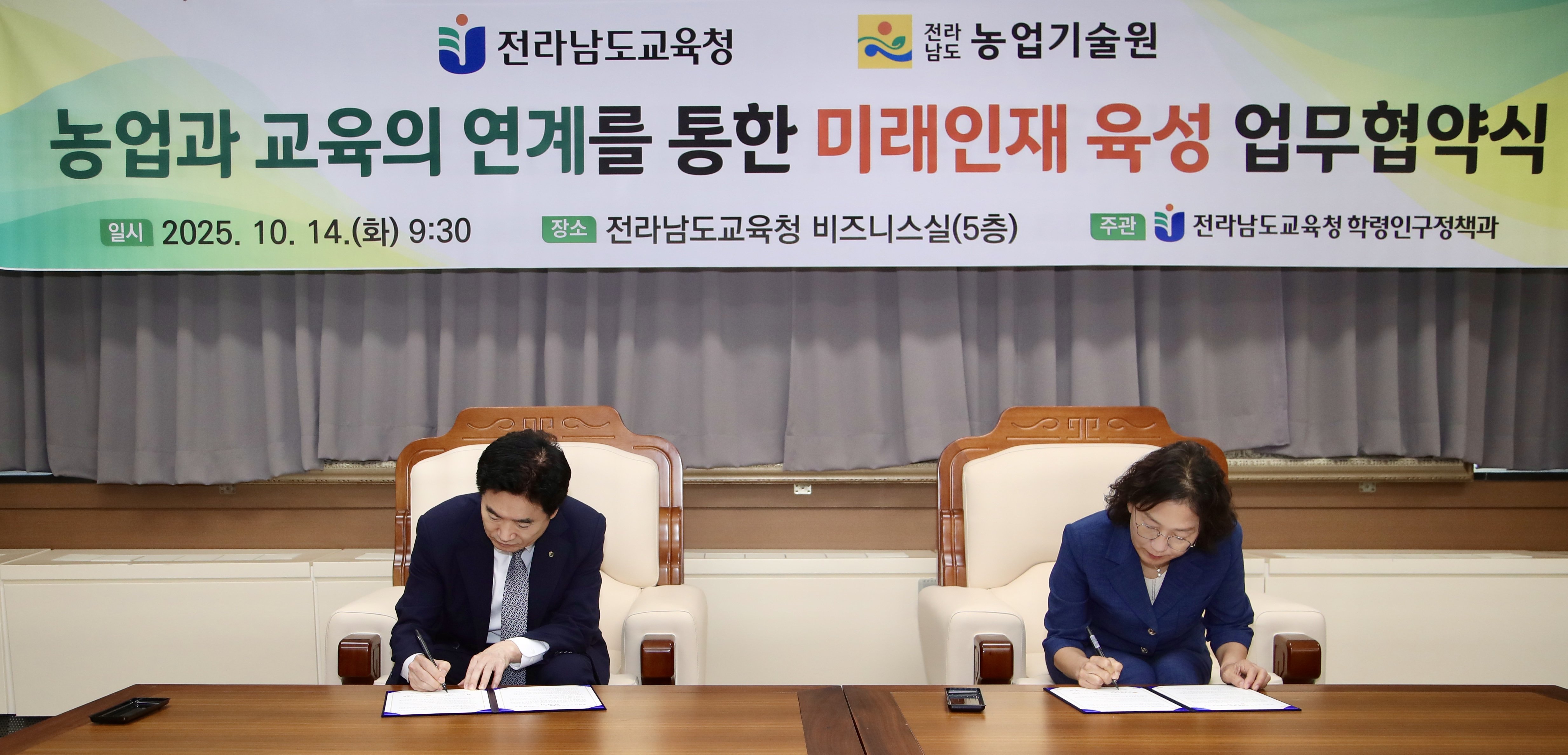 전라남도교육청은 10월 14일 청사 5층 비지니스실에서 전라남도 농업기술원 (원장 김행란)과 ‘농업과 교육의 연계를 통한 미래인재 육성 업무협약’을 체결했다.
