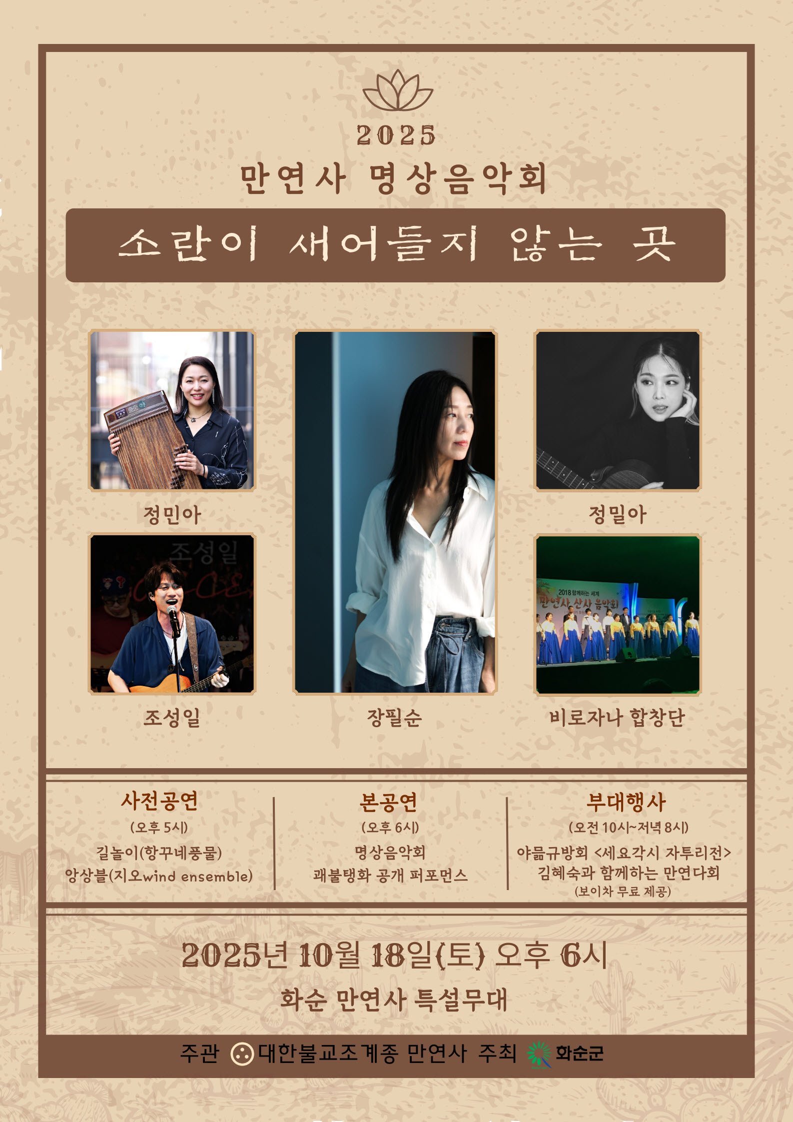 화순군이 주최하고 만연사가 주관하는 이번 산사음악회는 1208년 설립된 천년고찰 만연사의 운치 있는 풍경을 배경 삼아 ‘소란이 새어들지 않는 곳’ 이란 주제의 명상음악회를 통해 마음자리를 들여다보는 시간으로 기획됐다.