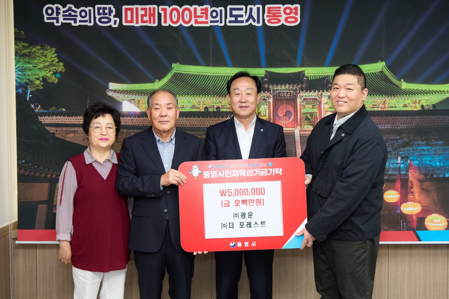 [한국Q뉴스] ㈜광운(대표 윤석보)과 ㈜더 포레스트(대표 이경봉)는 지난 13일 통영시청을 방문해 지역 인재 양성을 위해 써달라며 인재육성기금 500만원을 기탁했다.