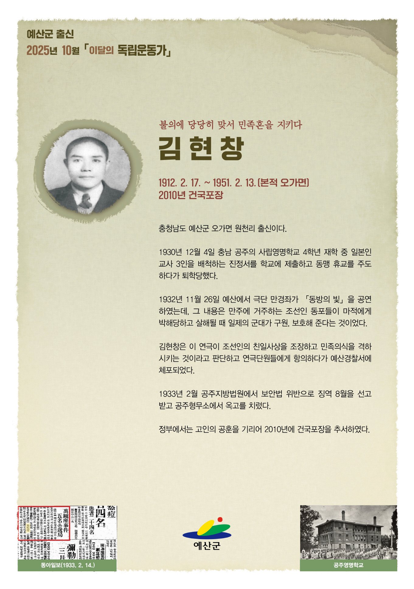 사진설명 : 2025년 10월 이달의 독립운동가 포스터(김현창).