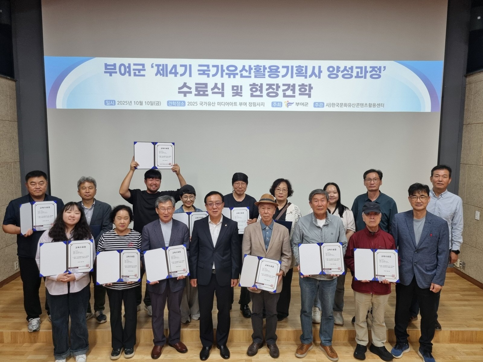 [한국Q뉴스] 부여군(군수 박정현)은 지난 10일 정림사지박물관에서 ‘제4기 국가유산활용기획사 양성 과정’의 수료식을 개최했다고 밝혔다.