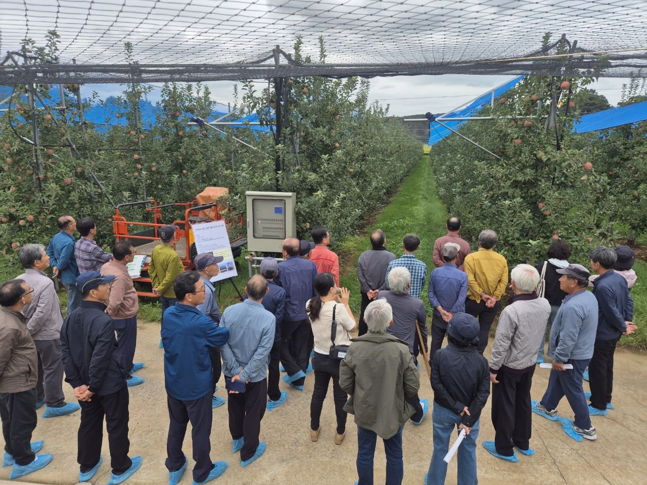 또한 사과 햇빛차단망 보급 시범사업은 2023년 1ha를 시작으로 현재 관내 4ha까지 확대 보급되고 있는 사업으로 이상기후로 인한 일소와 우박피해에 큰 효과가 있어 과실 상품과율 증진, 농가 조수입 33% 증대라는 성과를 거뒀다.