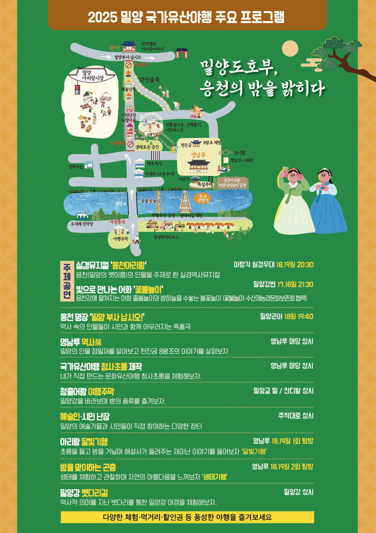 2025년 밀양 국가유산 야행은 국보 영남루를 중심으로 밀양관아, 밀양아리랑, 백중놀이 등 밀양의 유·무형 문화유산의 가치를 재조명하고 공유하기 위한 문화유산 활용 사업으로 2020년부터 6년 연속 국가유산청 공모사업에 선정돼 개최해 오고 있다.