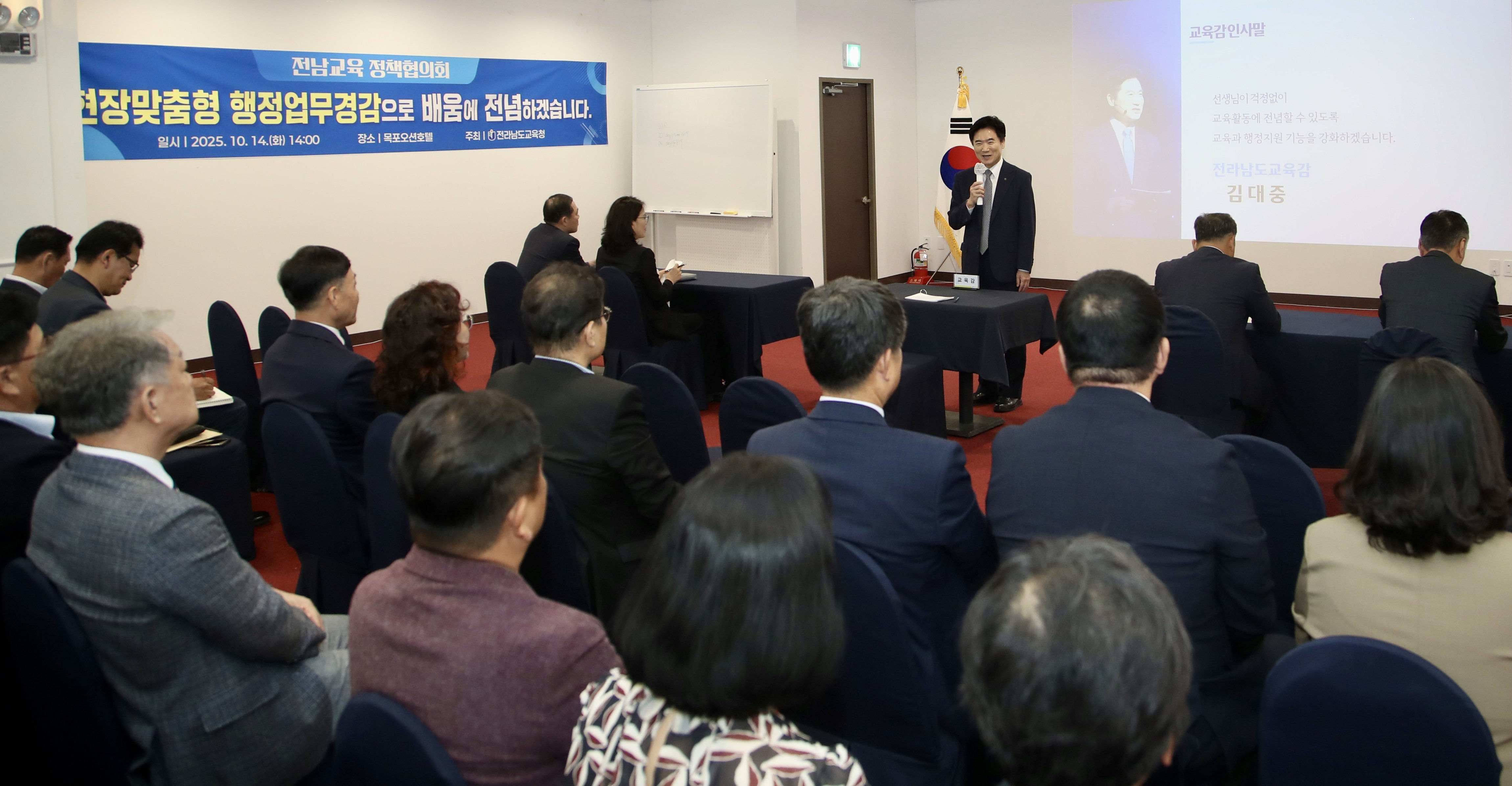 [한국Q뉴스] 전라남도교육청(교육감 김대중)은 14일 목포에서 ‘현장맞춤형 행정업무경감으로 배움에 전념하겠습니다’를 주제로 2025년 10월 정책협의회를 개최했다.