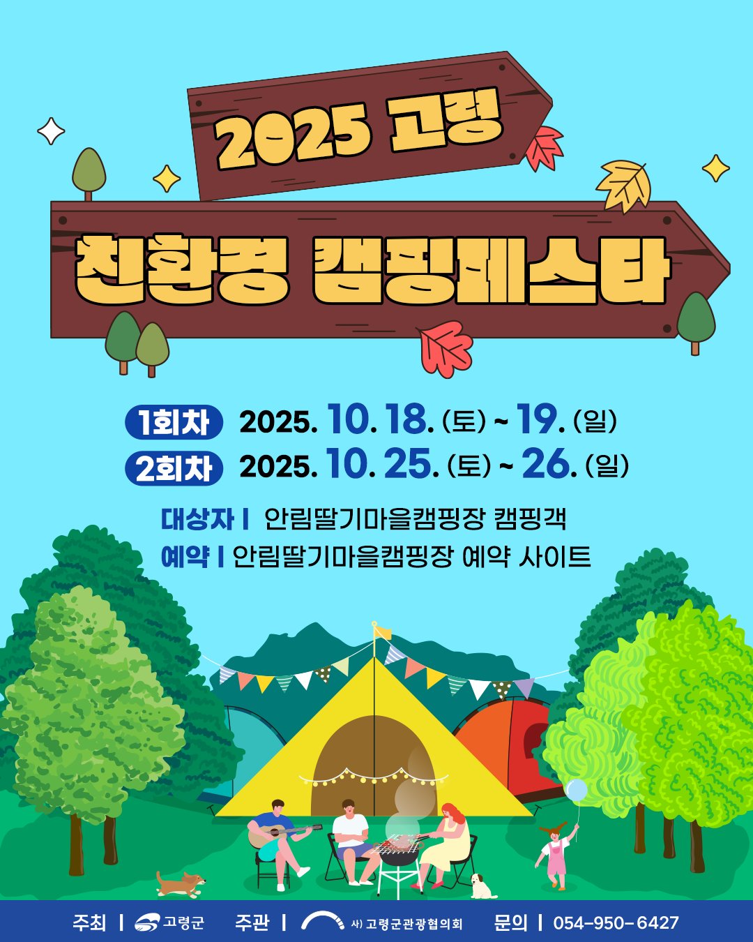[한국Q뉴스] 지역과 미래를 배려하는 친환경 캠핑 문화 확산을 위해 마련된 ‘2025 고령 캠핑 페스타’ 가 오는 10월 18일(토)부터 19일(일), 10월 25일(토)부터 26일(일) 두 차례에 걸쳐 안림딸기마을캠핑장에서 열린다.