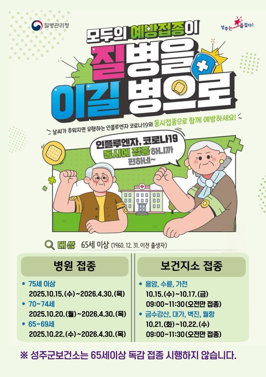 [한국Q뉴스] 성주군은 15일부터 65세 이상 어르신을 대상으로 인플루엔자(독감) 무료 예방접종을 관내 위탁의료기관 및 보건지소에서 실시한다.