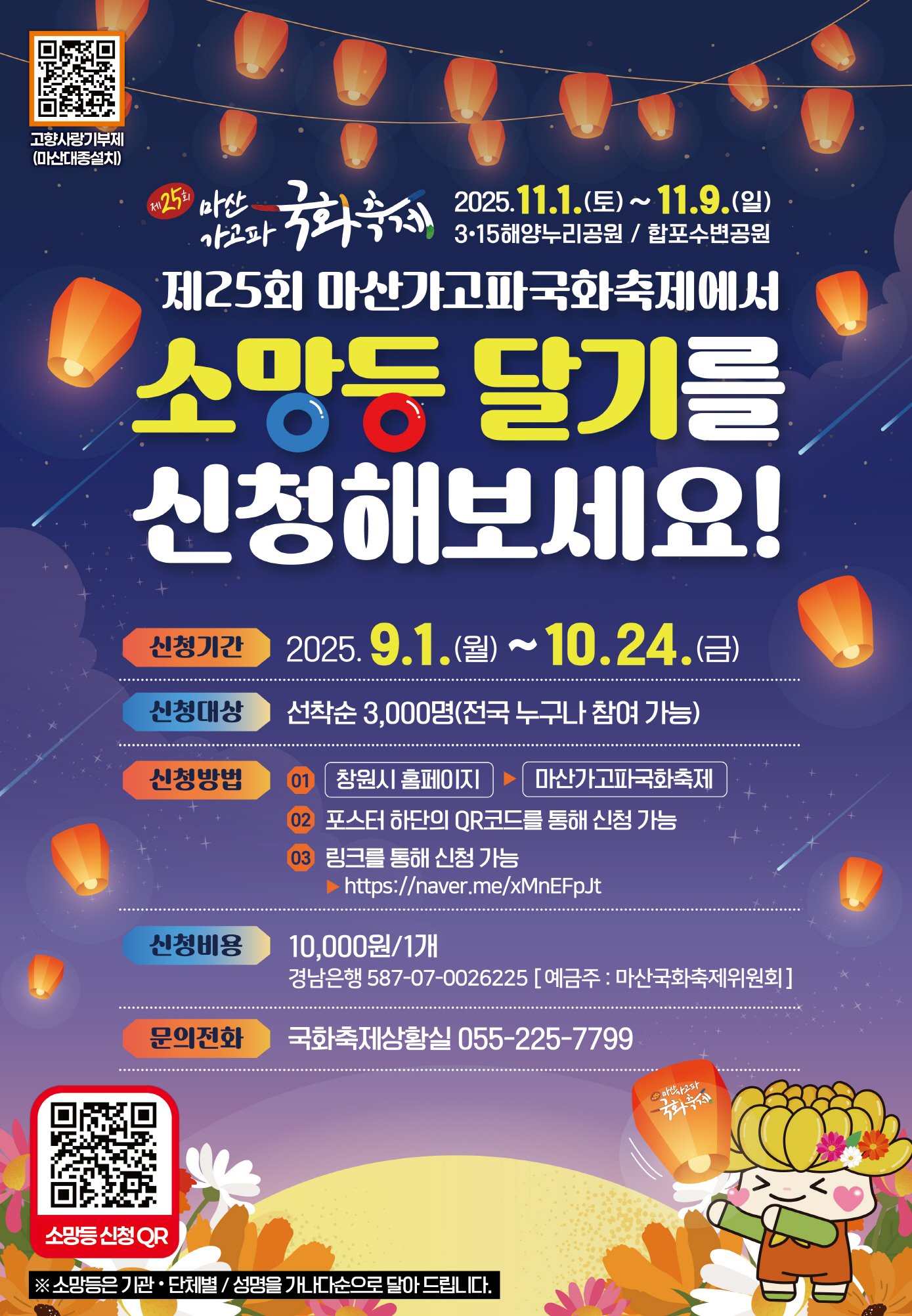 소망등은 기관- 단체별, 성명 가나다순으로 제1축제장(3.15해양누리공원)와 제2축제장(합포수변공원)을 잇는 연결로 구간에 조성되며 구체적인 위치는 추후 국화축제 누리집 공지사항에 안내된다.