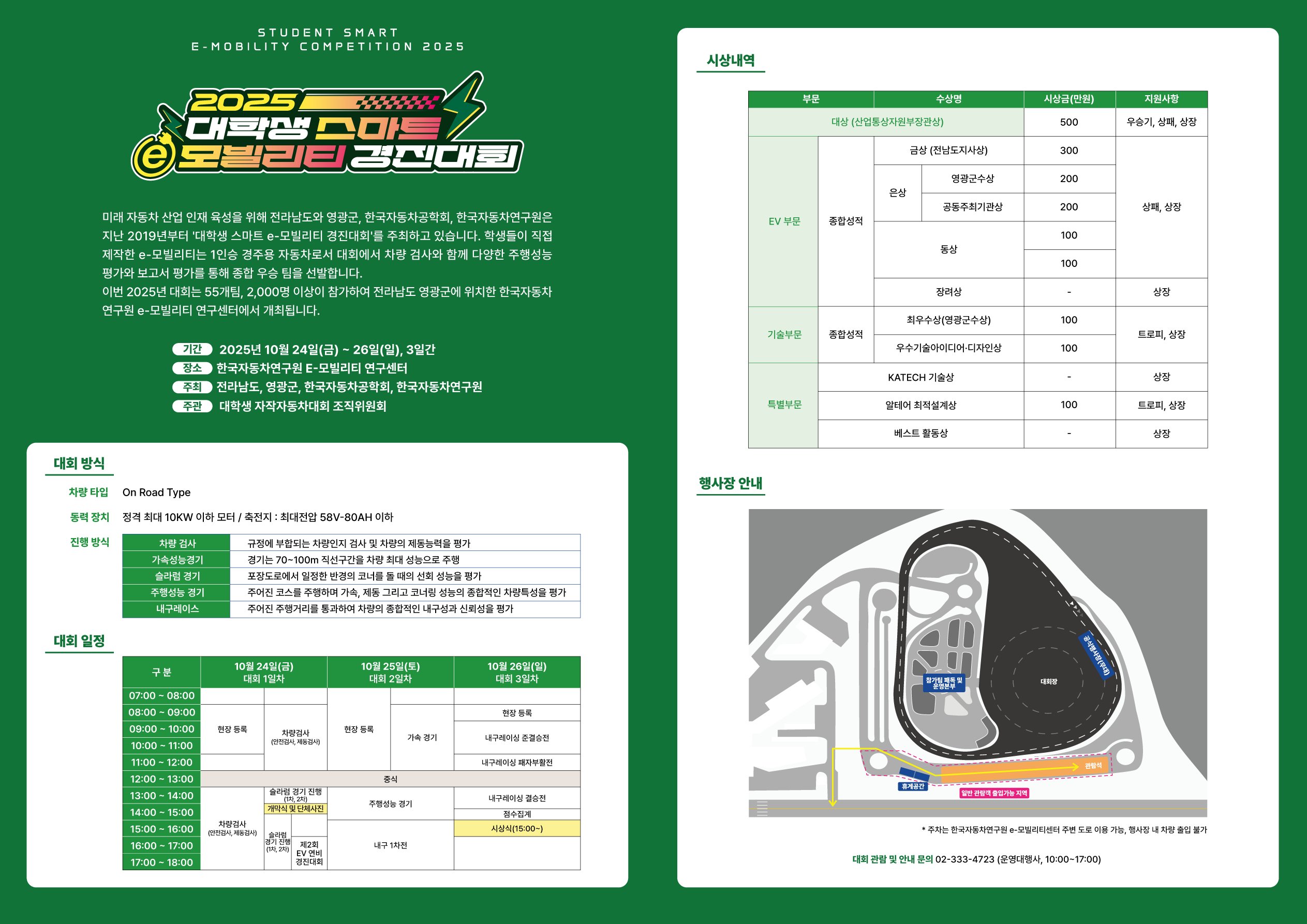 [한국Q뉴스] 전라남도와 영광군, (사)한국자동차공학회는 오는 10월 24일(금)부터 26일(일)까지 3일간 영광군 대마면 한국자동차연구원 e-모빌리티 연구센터 일원에서 ‘2025 대학생 스마트 e-모빌리티 경진대회’를 개최한다고 밝혔다.