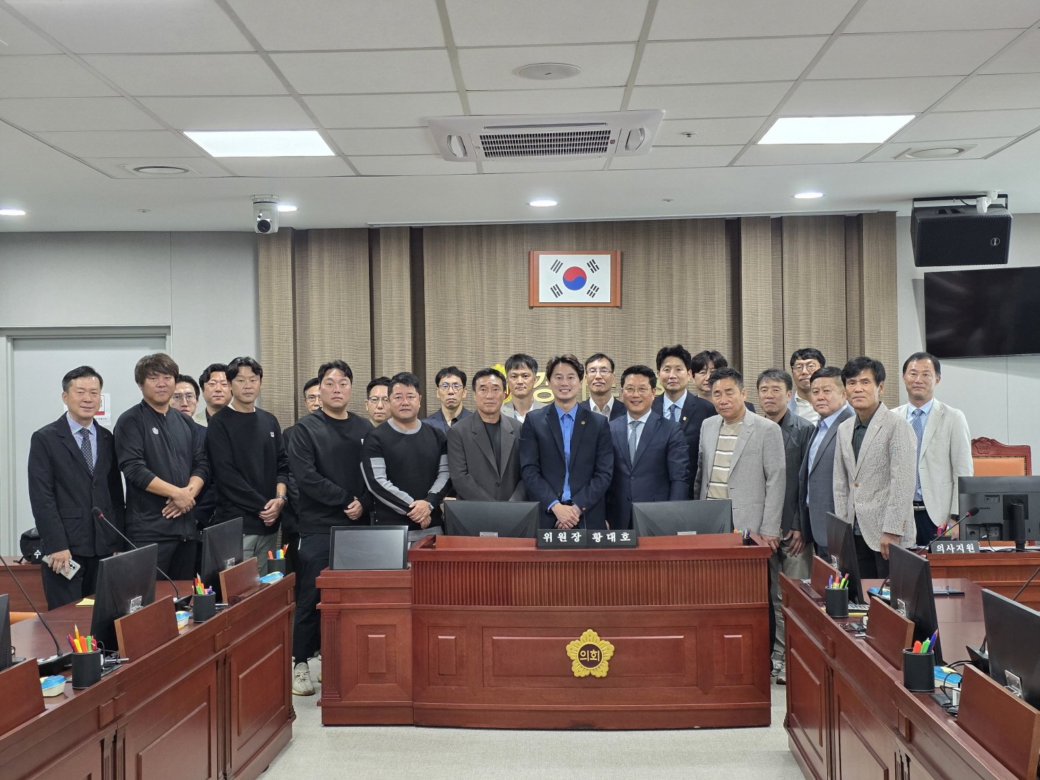 [한국Q뉴스] 경기도의회 문화체육관광위원회 황대호 위원장(더불어민주당, 수원3)이 15일(수) 한국대학축구연맹 박한동 회장을 비롯한 연맹 관계자들 및 도내 소재 대학 축구팀 감독들과 경기도 축구 활성화를 위한 정담회를 가졌다.
