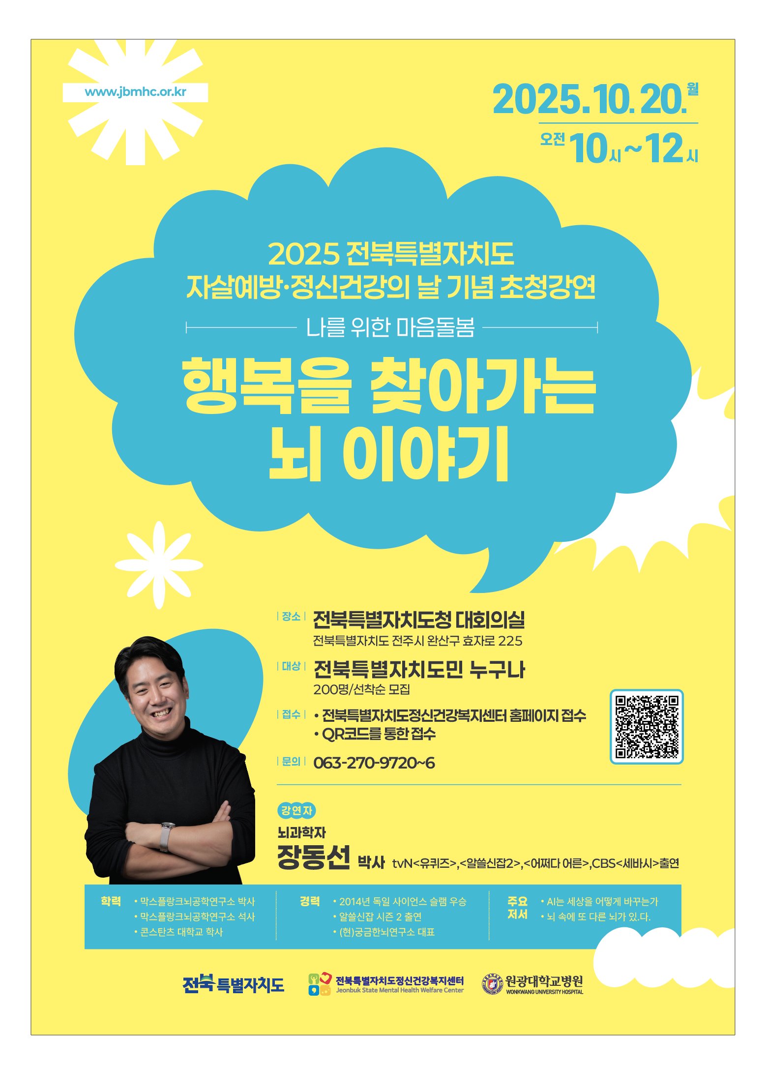 [한국Q뉴스] 전북도, 자살예방의 날- 정신건강의 날 기념 도민 강연 마련 “행복을 찾아가는 뇌 이야기”뇌과학자 장동선 박사 초청 마음건강과 생명존중의 가치, 도민과 함께 나누는 자리 전북특별자치도가 자살예방의 날(9월 10일)과 정신건강의 날(10월 10일)을 기념해 오는 10월 20일(월) 오전 10시, 도청 4층 대회의실에서 도민과 유관기관 종사자 300여명이 참여하는 ‘나를 위한 마음돌봄 특별강연’을 연다.