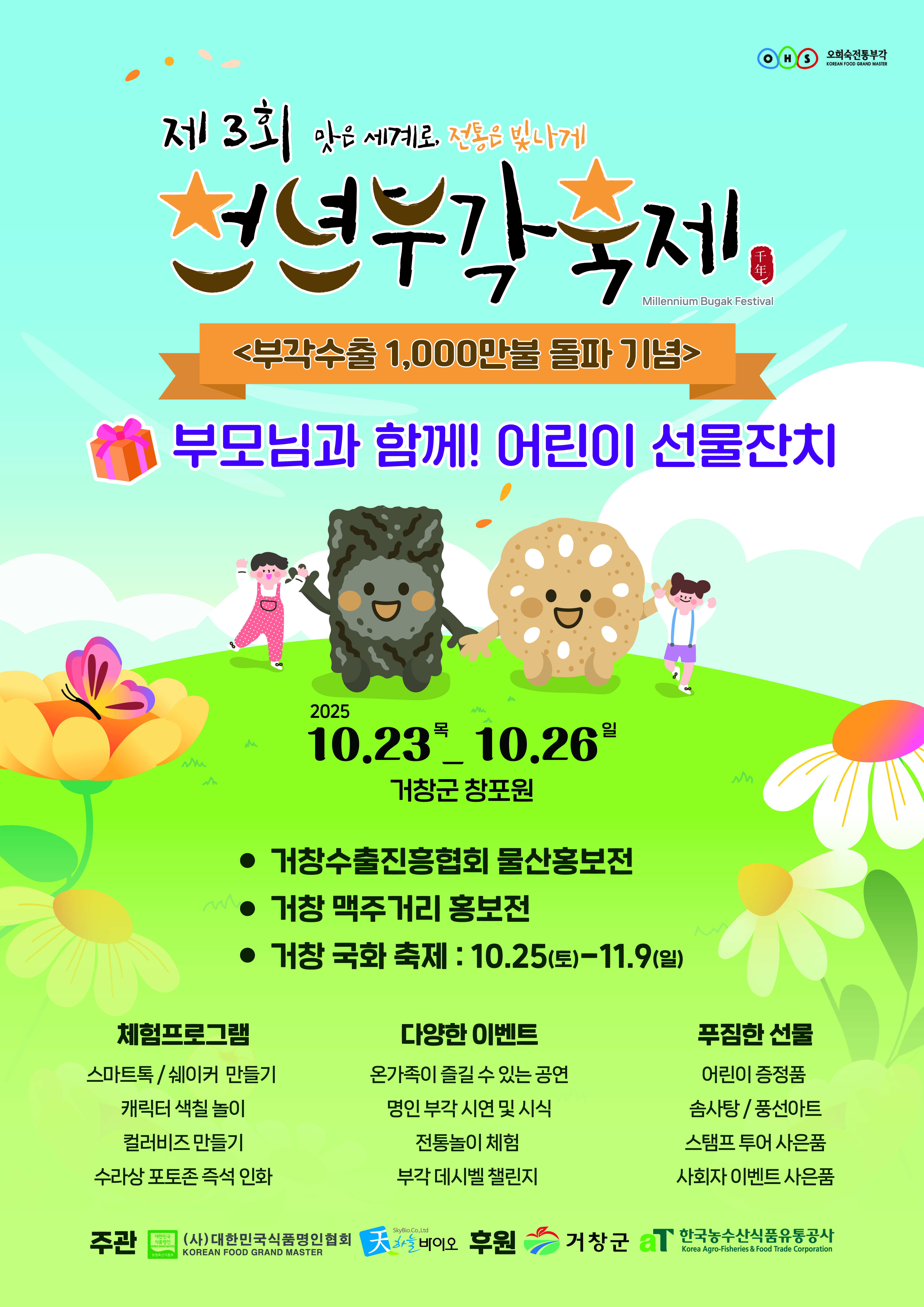 [한국Q뉴스] 부각의 모든 것을 만나는 국내 유일의 부각 전시회 국내 유일의 ‘부각’ 전문 전시축제인 제3회 천년부각축제가 오는 10월 23일부터 26일까지 4일간, 경남 거창군 남상면 거창창포원 잔디광장에서 열린다.