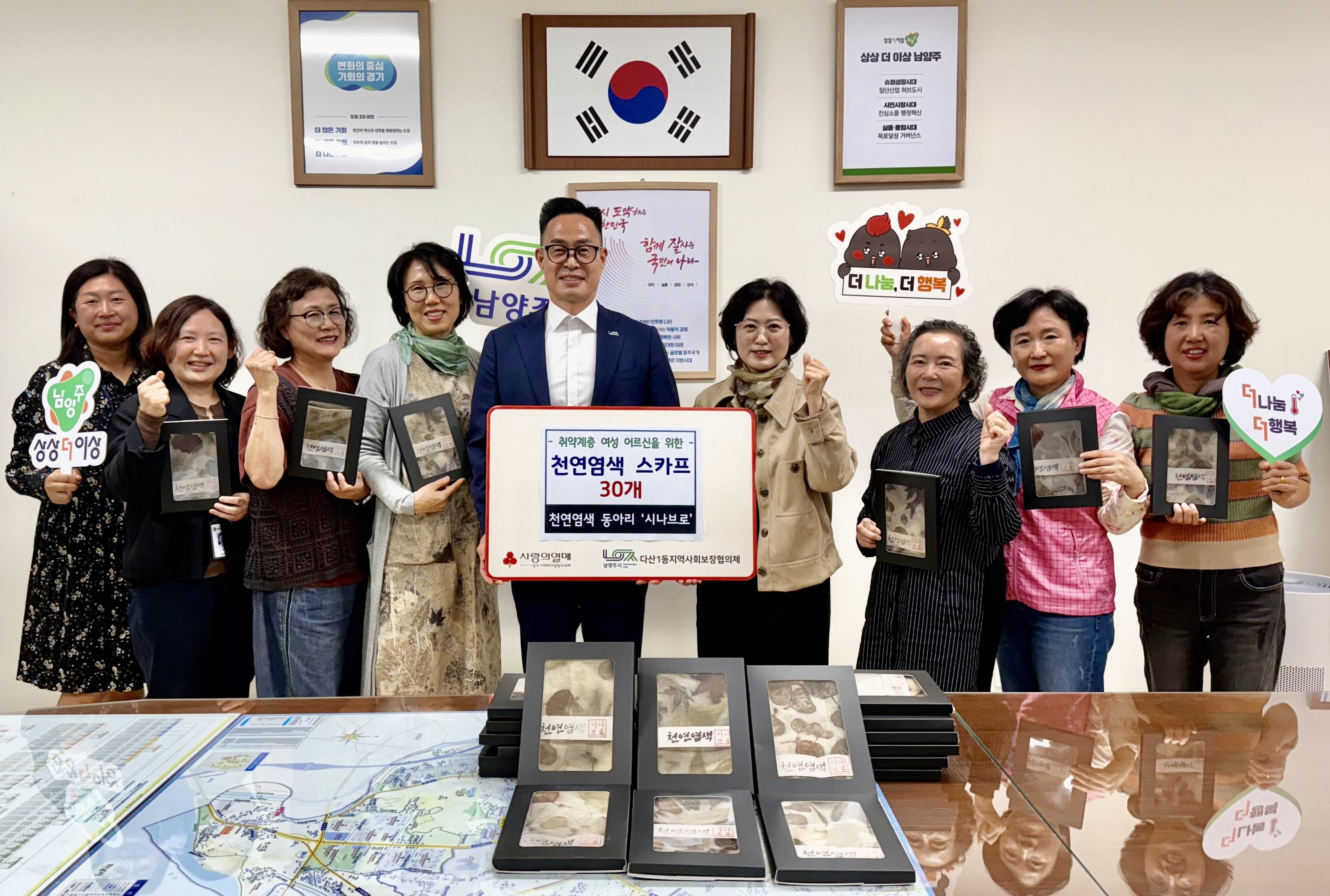 [한국Q뉴스] 남양주시(시장 주광덕)는 14일 천연염색 동아리 ‘시나브로’ 가 천연염색 체험을 통해 직접 제작한 스카프 30개를 다산1동 지역사회보장협의체(위원장 정순옥)에 기탁해 나눔의 가치를 실천했다고 밝혔다.