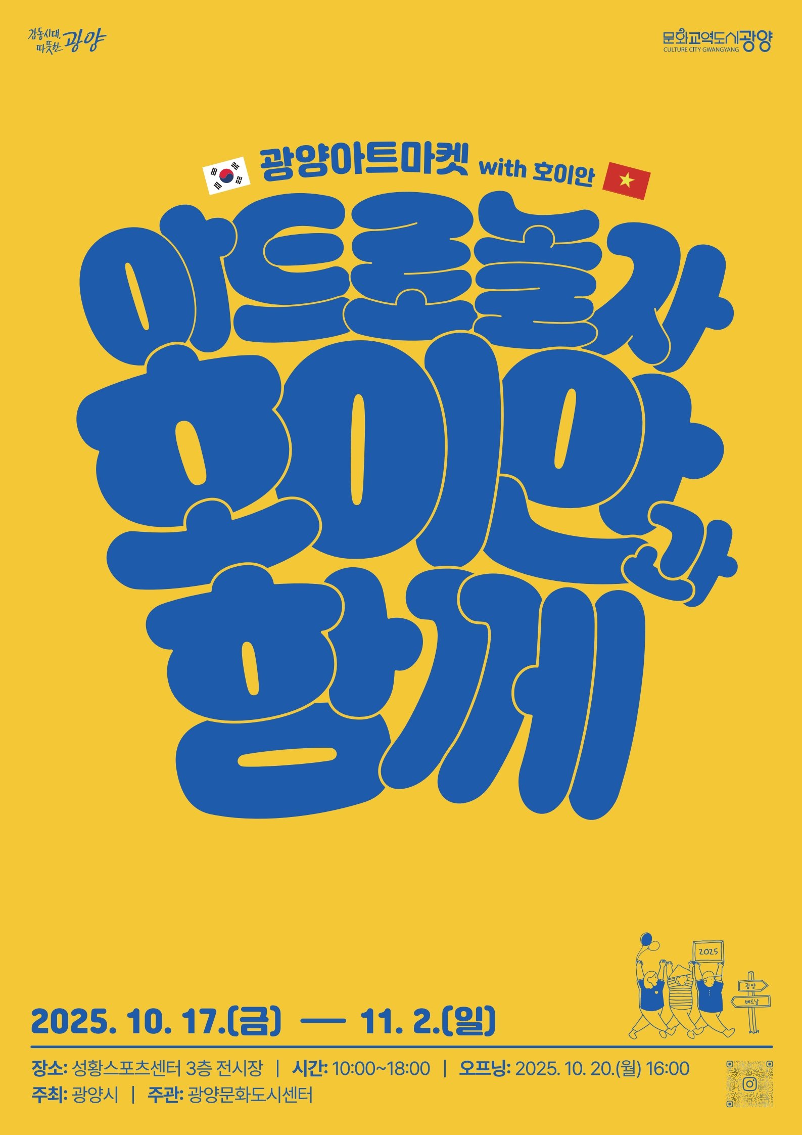 [한국Q뉴스] 광양문화도시센터(센터장 박시훈, 이하 ‘센터’)는 오는 10월 17일부터 11월 2일까지 성황스포츠센터 다목적체육관 3층 대회운영본부와 로비에서 ‘광양아트마켓 위드 호이안(with Hoi An) 아트로 놀자!