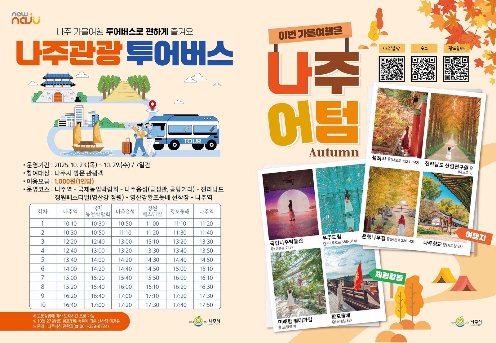 [한국Q뉴스] 전라남도 나주시(시장 윤병태)는 오는 10월 23일부터 29일까지 열리는 ‘2025 국제농업박람회’ 기간 동안 나주의 주요 관광지와 ‘2025 전라남도 정원페스티벌’ 이 열리는 영산강정원을 순환하는 ‘나주관광 투어버스’를 운영한다고 밝혔다.