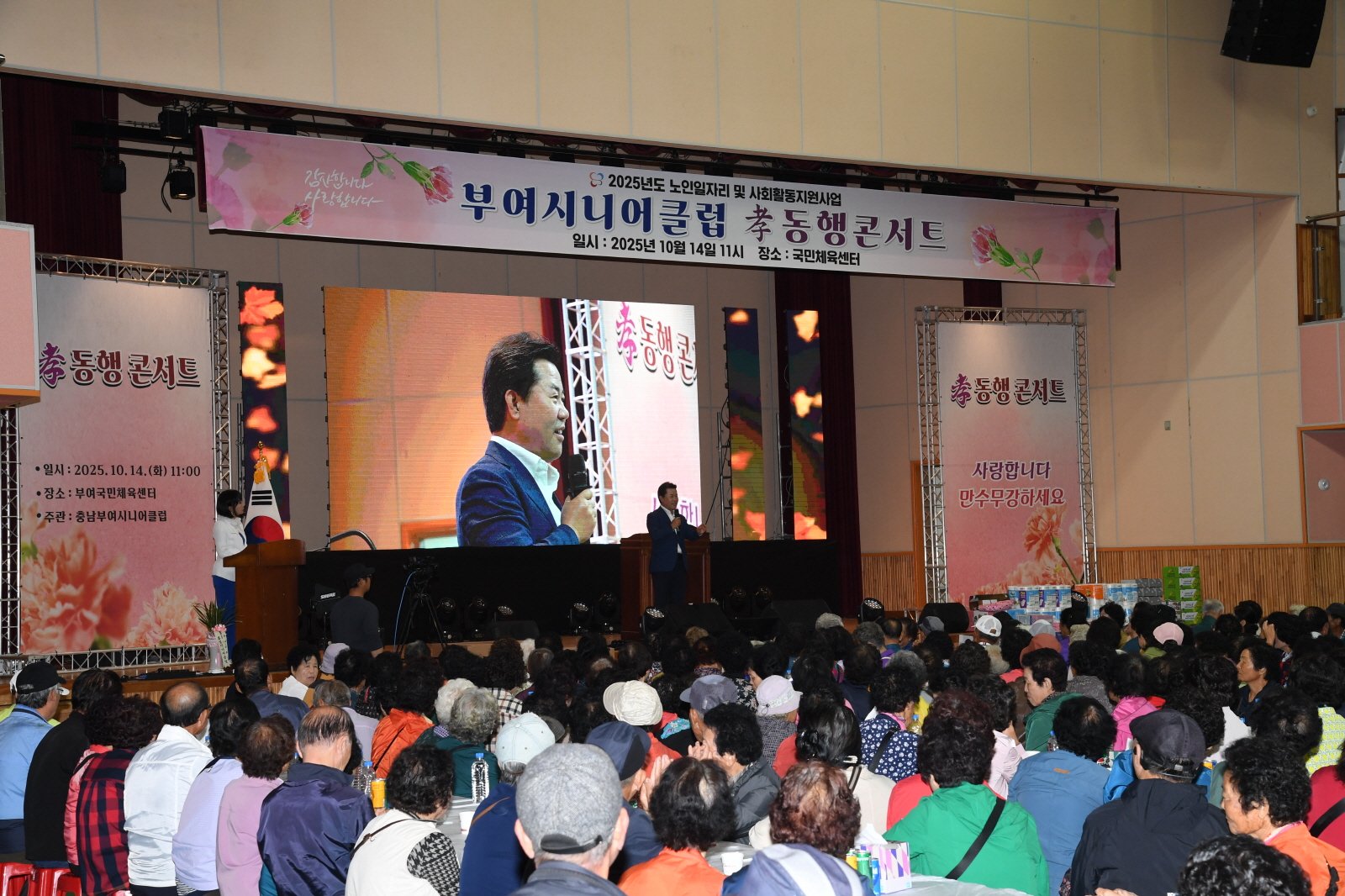 [한국Q뉴스] 부여시니어클럽은 지난 14일 부여국민체육센터에서 노인일자리 및 사회활동 지원사업 참여 어르신 약 1,800명을 대상으로 문화 활동인 ‘孝 동행 콘서트’ 행사를 성황리에 개최했다.