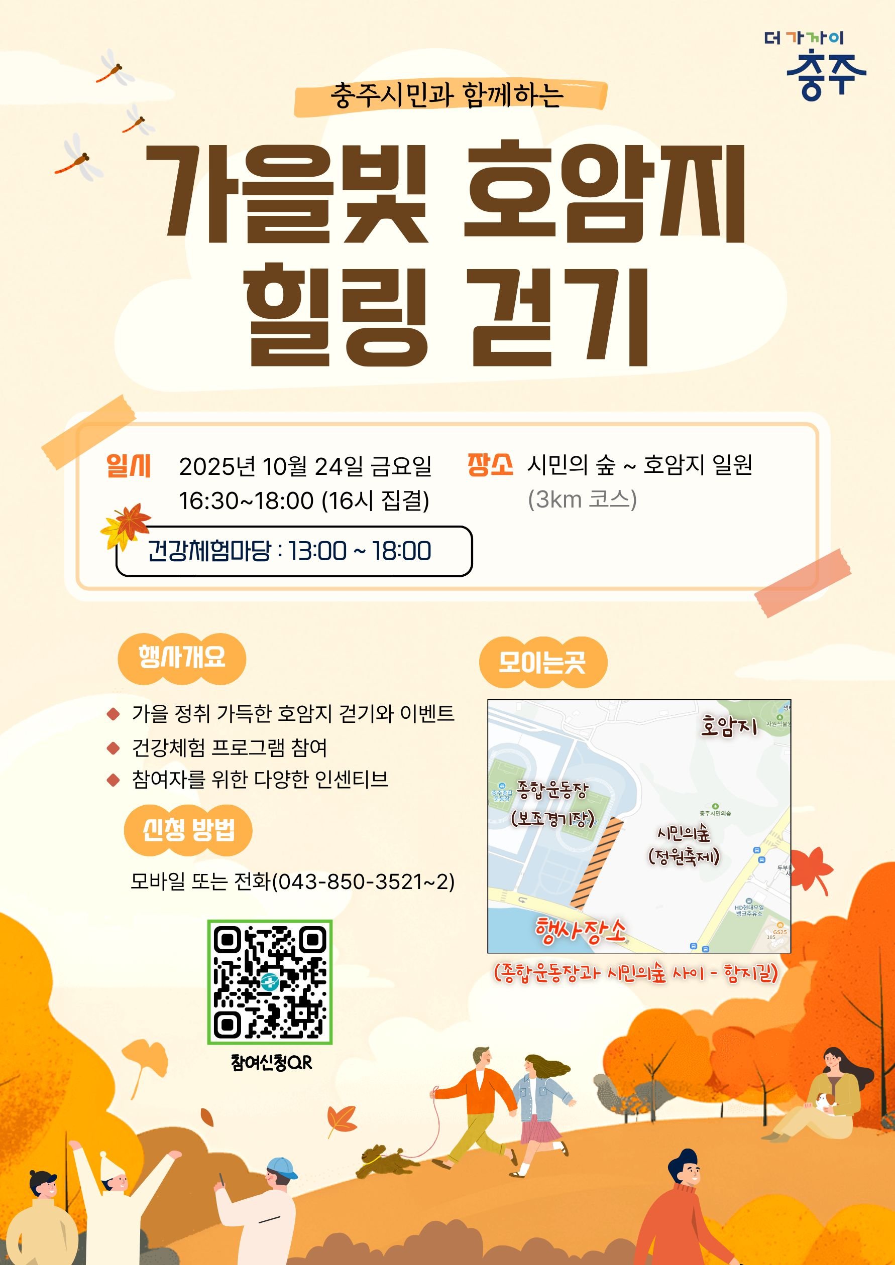 정상구 충주시보건소장은 “호암지는 충주시민이 가장 사랑하는 산책 명소로 가을빛 풍경 속에서 건강과 즐거움을 동시에 느낄 수 있는 소중한 시간이 될 것”이라며 “많은 시민들이 가족, 이웃과 함께 참여해 일상 속 건강한 변화를 경험하시길 바란다”고 전했다.
