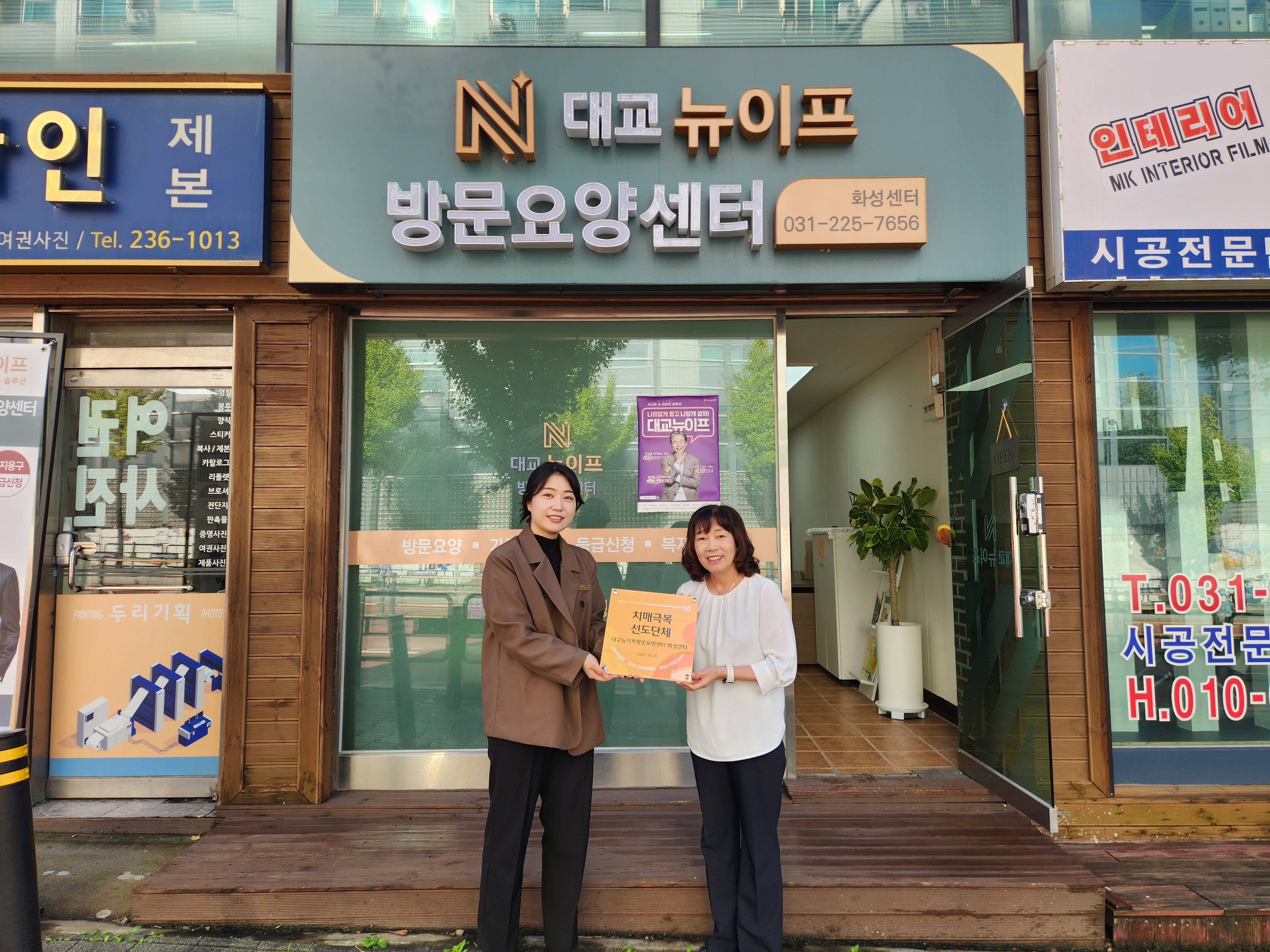 [한국Q뉴스] 화성특례시(시장 정명근)가 16일 병점동 소재 대교뉴이프 방문요양센터 화성센터를 ‘치매극복 선도단체’로 신규 지정하고 현판 전달식을 가졌다.