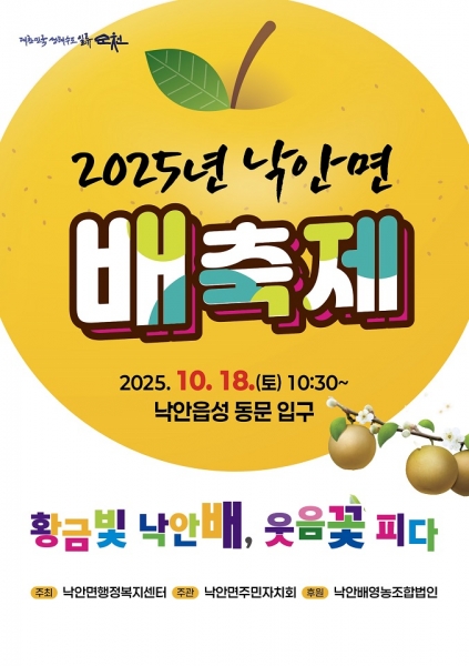 이번 축제는 낙안면 주민자치회가 주관해 지역 특산물인 ‘배’를 주제로 직접 기획하고 준비한 주민 주도형 축제로 주민참여예산 사업으로 추진돼 더욱 뜻깊은 행사가 될 전망이다.