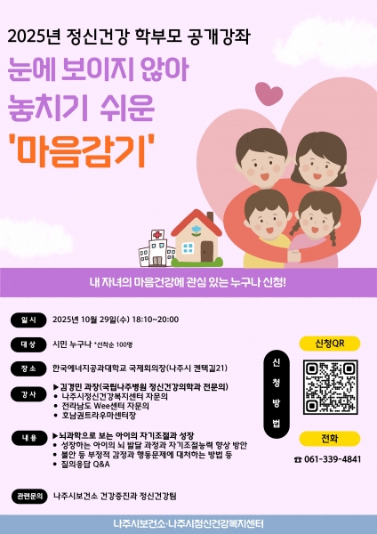 강용곤 나주시 보건소장은 “이번 강좌를 통해 학부모들이 자녀의 정신건강에 대해 더 잘 이해하고 건강한 양육 방법을 알아가는 시간이 되길 바란다”며 “앞으로도 부모와 자녀의 정신건강 증진을 위한 사업을 적극 추진하겠다”고 밝혔다.