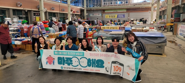 [한국Q뉴스] 장수군 정신건강복지센터는 ‘정신건강의 날’을 맞아 장수시장 일원에서 군민의 정신건강 인식 제고와 생명존중문화 확산을 위한 인식개선 캠페인을 진행했다고 17일 밝혔다.