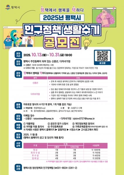 [한국Q뉴스] 평택시는 2025년 평택시 인구정책 생활수기 공모전 ‘평택에서 행복을 택하다’를 오는 10월 31일까지 개최한다고 밝혔다.