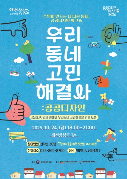 [한국Q뉴스] 밀양문화관광재단은 오는 24일 오후 6시 해천상상루에서 ‘우리 동네 고민 해결사, 공공디자인’ 워크숍을 개최한다고 17일 밝혔다.