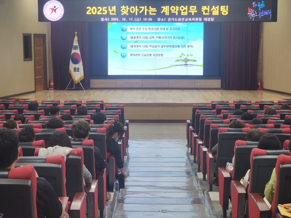 [한국Q뉴스] 용인교육지원청은 10월 17일 청사 4층 대강당에서 관내 공·사립학교 행정실장 및 계약업무 담당자 120명을 대상으로 ‘2025년 찾아가는 계약업무 컨설팅 및 대면 연수’를 실시했다.