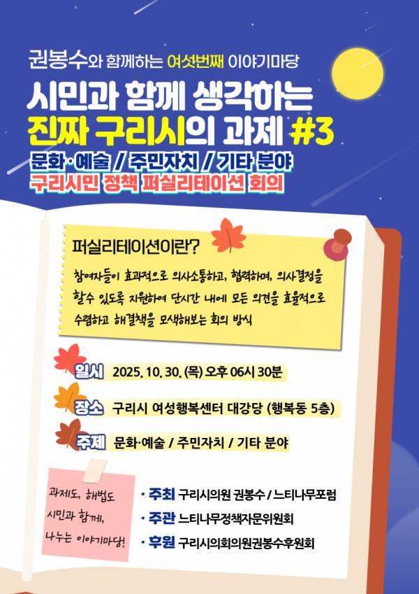 [한국Q뉴스] 권봉수 구리시의원과 느티나무포럼이 주최하는 ‘권봉수와 함께하는 여섯번째 이야기 마당’ 이 오는 10월 30일 오후 6시 30분에 구리시 여성행복센터 대강당에서 개최될 예정이다.