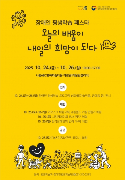 [한국Q뉴스] 시흥시는 오는 10월 24일부터 26일까지 3일간, 시흥ABC행복학습타운 아람관과 어울터 일원에서 ‘2025 장애인 평생학습 페스타’를 개최한다.