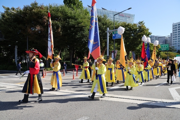 사또 분장을 한 박강수 마포구청장과 취타대, 풍물패, 동별 기수단 등 행렬은 신명나는 음악과 함께 마포구청 앞 마포구민광장을 출발해 월드컵광장 평화공원 수변무대까지 행진했다.