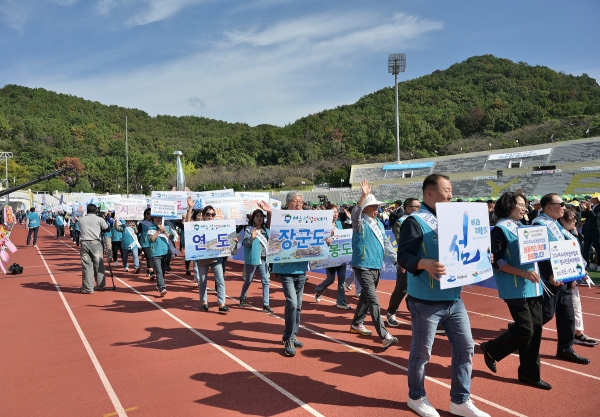 [한국Q뉴스] 여수시는 지난 17일 진남경기장에서 열린 ‘2025 여수시민의 날 기념행사’ 입장식에서 2026여수세계섬박람회 홍보 행진을 펼쳤다.