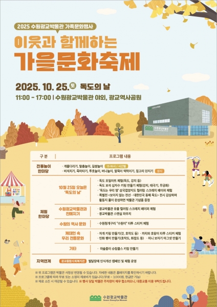 [한국Q뉴스] 수원광교박물관은 독도의 날인 10월 25일 오전 11시부터 오후 5시까지 수원광교박물관 야외에서 ‘2025 수원광교박물관 가족문화행사–이웃과 함께하는 가을문화축제’를 연다.