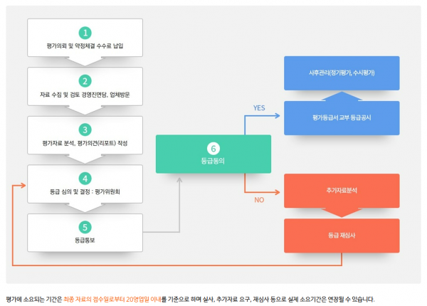 일반 신용평가사는 법이 정한 6가지 요건 중 단 1가지만 충족해도 평가를 개시할 수 있으며 수수료를 추가로 내면 하루 만에 등급 결과를 발급받을 수 있다.