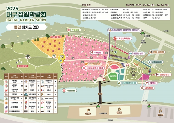 [한국Q뉴스] 대구광역시는 일상 속 정원문화를 확산하고 도심 속 녹색 힐링공간을 선보이는 ‘2025 대구정원박람회’를 10월 24일부터 28일까지 5일간 금호강 하중도 일원에서 개최한다.