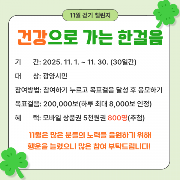 [한국Q뉴스] 광양시는 지역 주민의 건강생활 실천을 돕기 위해 11월 1일부터 30일까지 모바일 걷기 앱 ‘워크온’에서 ‘건강으로 가는 한걸음 11월 걷기 챌린지’를 운영한다고 밝혔다.