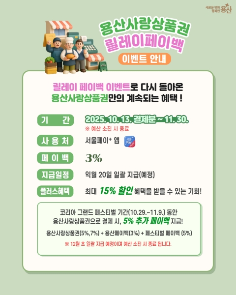특히 10월 29일부터 11월 9일까지 열리는 ‘코리아 그랜드 페스티벌’ 기간에 용산사랑상품권으로 결제하면, 추가 5% 페이백 혜택이 제공될 예정이다.