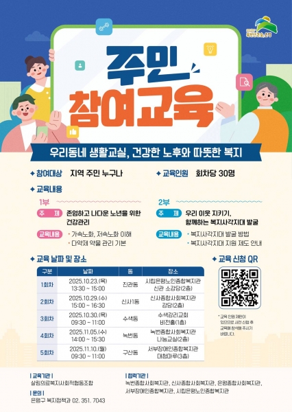 [한국Q뉴스] 서울 은평구는 주민 참여 교육 ‘우리동네 생활 교실, 건강한 노후와 따뜻한 복지’를 운영하고 신청자를 모집한다고 밝혔다.