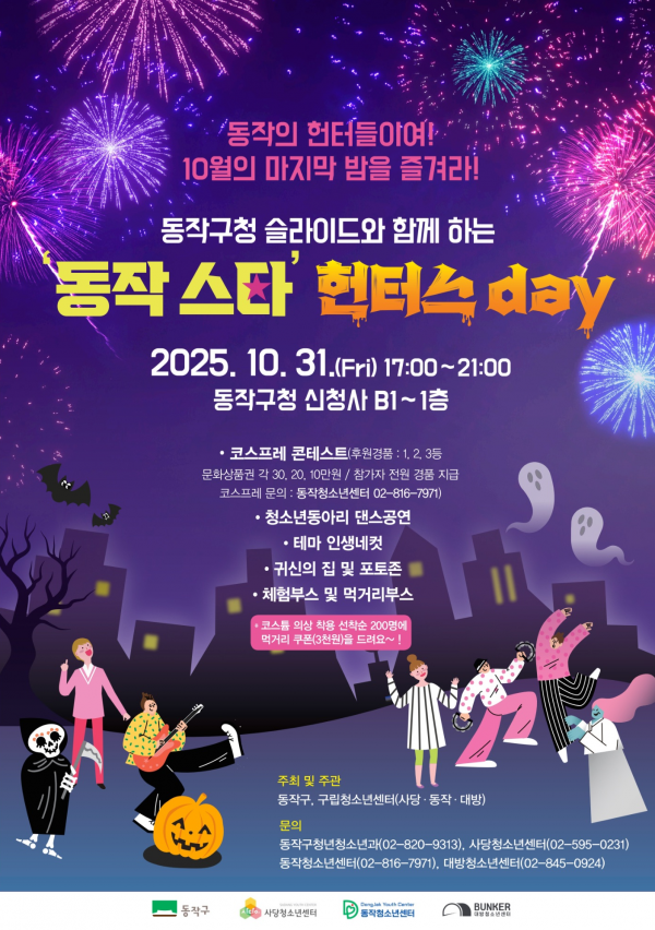 [한국Q뉴스] 동작구가 오는 10월 31일 오후 5시부터 9시까지, 구청 신청사에서 청소년이 직접 기획하고 운영하는 제1회 핼러윈 축제‘‘동작 스타’ 헌터스day’를 개최한다고 밝혔다.