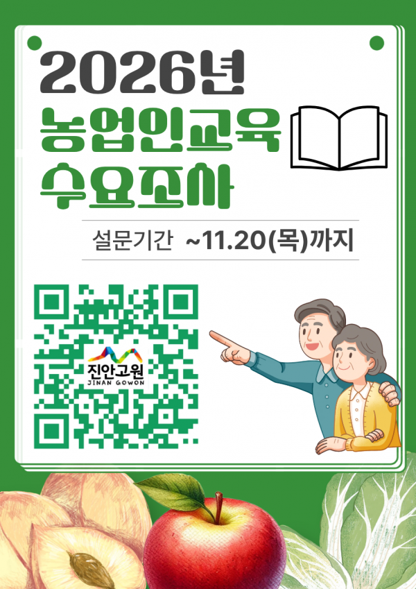 [한국Q뉴스] 진안군은 2026년도 진안환경농업대학 및 농업인교육 과정 선정을 위해 10월 21일부터 11월 20일까지 한 달간 진안군민과 농업인의 다양한 의견을 반영하기 위한 ‘농업인 교육 수요조사’를 실시한다.