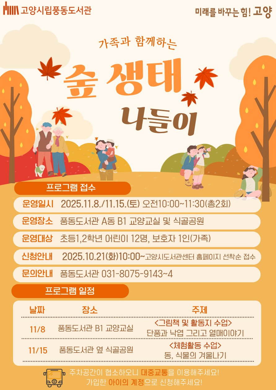 [한국Q뉴스] 고양특례시(시장 이동환) 풍동도서관은 공공도서관 독서문화 프로그램 ‘가족과 함께하는 숲 생태 나들이’를 운영한다.
