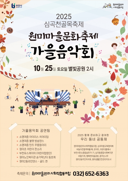 [한국Q뉴스] 부천시는 10월 25일 원미별마루와 별빛공원 일대에서 ‘2025년 심곡천 골목축제–원미마을문화축제 가을 음악회’를 연다.