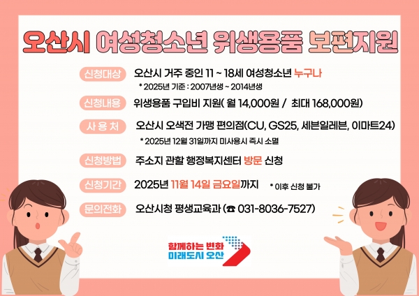 이권재 오산시장은 “이번 사업은 경제적 여건과 상관없이 모든 여성청소년이 불편함 없이 위생용품을 구매할 수 있도록 마련했다”며 “한 명의 청소년도 혜택에서 소외되지 않도록 끝까지 챙기겠다”고 말했다.