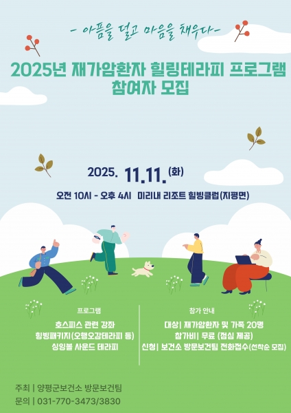 [한국Q뉴스] 양평군은 재가암환자와 그 가족을 대상으로 ‘2025년 재가암환자 힐링테라피 프로그램’ 대상자를 모집한다고 밝혔다.