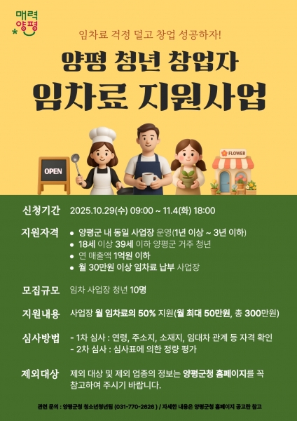 지원 대상은 △양평군에 주소를 둔 18세 이상 39세 이하 △공고일 기준 사업자등록증명 상 개업일 1년 이상 3년 이하 △연 매출액 1억원 이하 △월 임차료 30만원 이상 납부 중인 청년 창업자이다.
