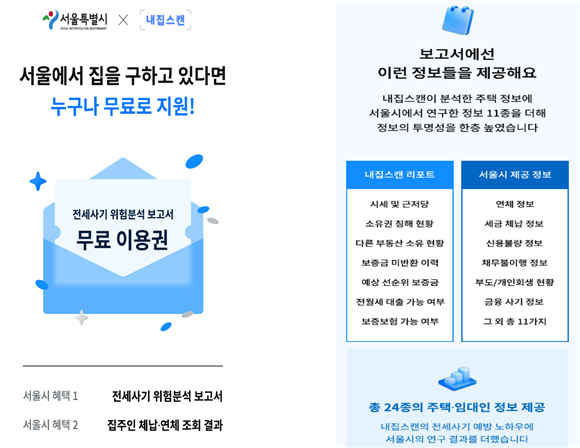 서울시는 이번 서비스가 임차인이 사전에 주택과 임대인의 숨겨진 위험 징후를 인지하고 안전한 계약을 체결하도록 지원해, 전세사기 피해를 근본적으로 줄여나가는 안전망이 될 것으로 기대하고 있다.