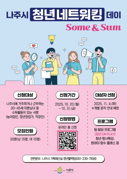 [한국Q뉴스] 전라남도 나주시가 지역 청년들의 교류와 소통을 활성화하기 위해 미혼청년을 대상으로 한 ‘청년 네트워킹 데이’ 참가자를 모집한다.