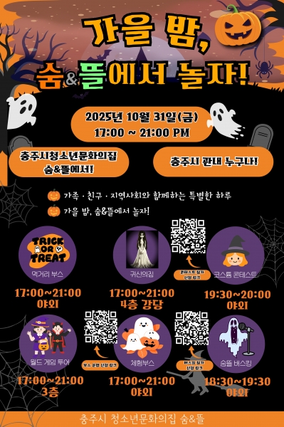 [한국Q뉴스] 충주시청소년문화의집 숨&뜰에서는 10월 31일 오후 5시부터 9시까지 ‘가을밤, 숨뜰에서 놀자’ 행사를 진행한다고 밝혔다.