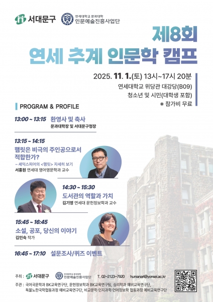 [한국Q뉴스] 서대문구가 연세대학교 문과대학과 공동으로 11월 1일 오후 1시부터 5시 20분까지 연세대 위당관 대강당에서 ‘제8회 연세 인문학 캠프’를 개최한다.