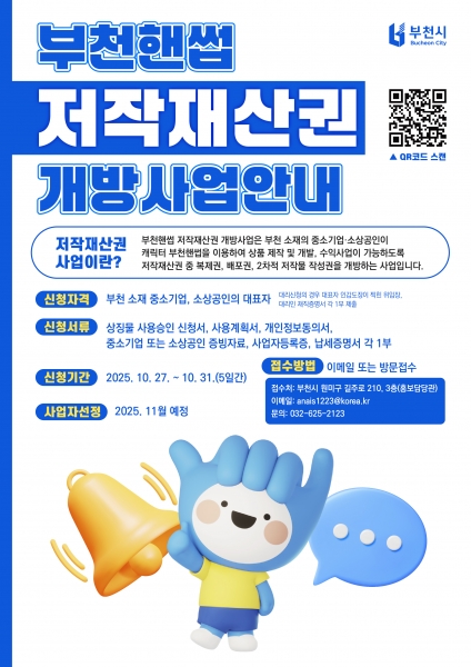 [한국Q뉴스] 부천시는 시 대표 캐릭터 ‘부천핸썹’의 저작재산권 일부를 관내 중소기업과 소상공인에게 개방하는 ‘2025년 2차 부천핸썹 저작재산권 개방사업’을 추진한다고 24일 밝혔다.