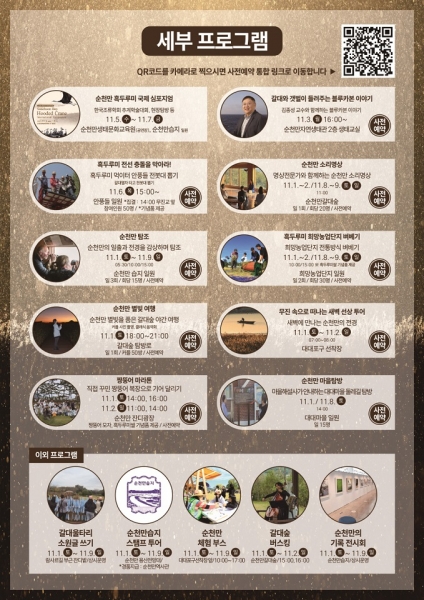 주요 프로그램은 마을 주민들이 직접 안내하는 △순천만 마을탐방 △흑두루미 관찰 체험 △순천만 소리명상 △새벽 선상 투어 △순천만 별빛 여행 △갈대울타리 소원글 쓰기 △희망농업단지 벼베기 등 자연과 교감하는 다채로운 프로그램이 운영된다.